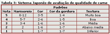 Para qualidade da carne são avaliados os seguintes itens (tabela 3): 1: marmoreio (1-12), coloração e brilho da carne (1-7), firmeza e textura da carne (1-7), coloração e qualidade da gordura (1-6). O valor final de qualidade da carne é dado pelo menor valor dos 4 atributos. Por exemplo, se as notas para uma carcaça forem: marmoreio 4, cor 4, textura 3 , e cor da gordura 4, então a nota para qualidade de carcaça será de 3.