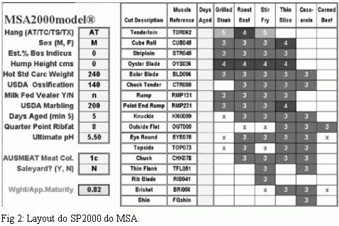 As informações tomadas do animal e da carcaça são computadas, e seus cortes classificados através de modelo SP2000 (layout na figura 2). A classificação para rotulagem e para fácil entendimento do consumidor é feita da seguinte forma: não classificado, 3, 4 ou 5 estrelas. Na tabela 4 são apresentados resultados de Thompson e Polkinghorne (2002) com relação à habilidade do modelo em classificar os cortes de acordo com a experiência do consumidor.