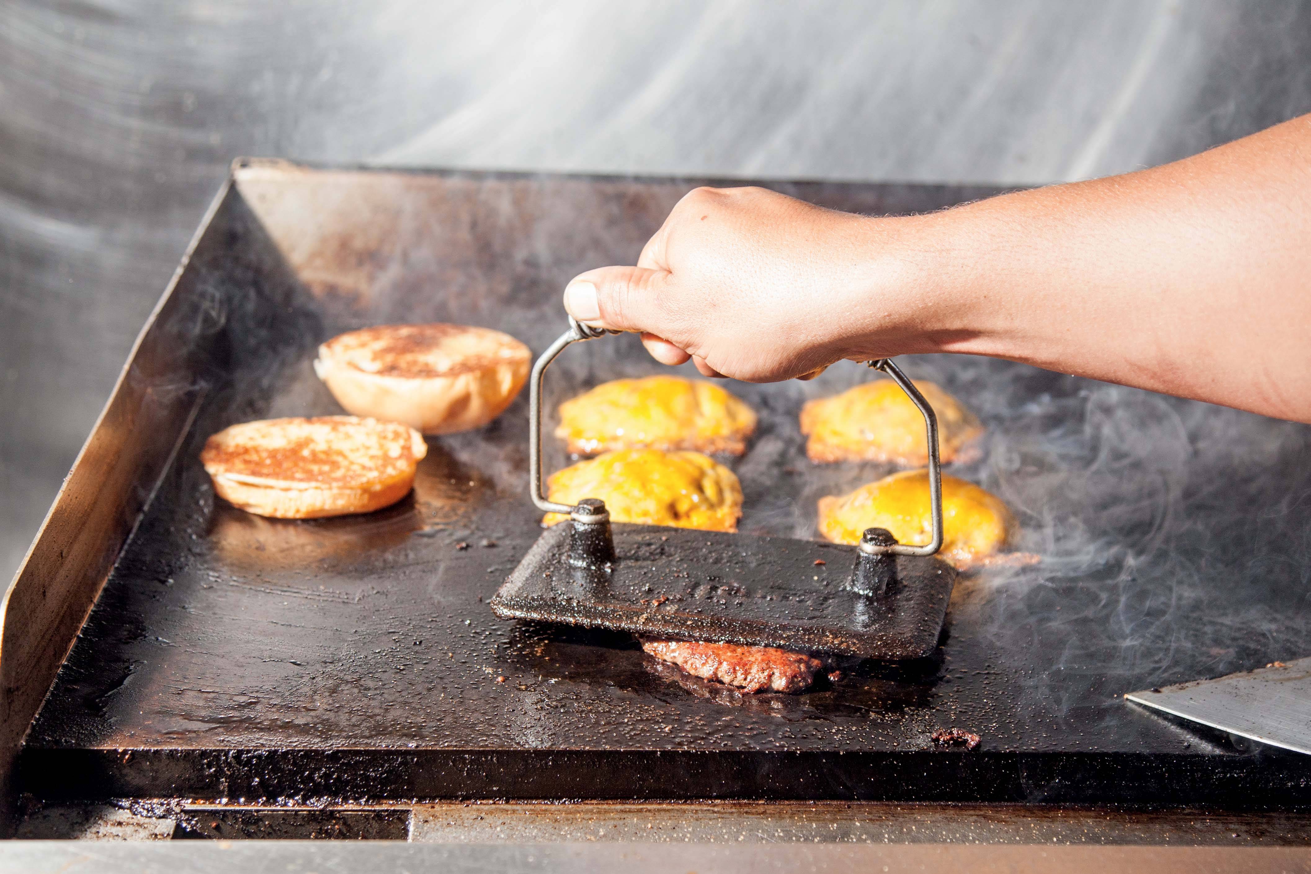 A bolota de acém de gado black angus moído vai à chapa e, com o auxílio de espátulas, é esmagada no metal pelando até ficar com cerca de 7 milímetros de altura. Cada lado é grelhado por 45 segundos, e o hambúrguer recheia o pão junto de cheddar com maionese, alface, tomate, cebola, picles e jalapeño, todos ingredientes opcionais mas que não aumentam o preço do sanduíche.