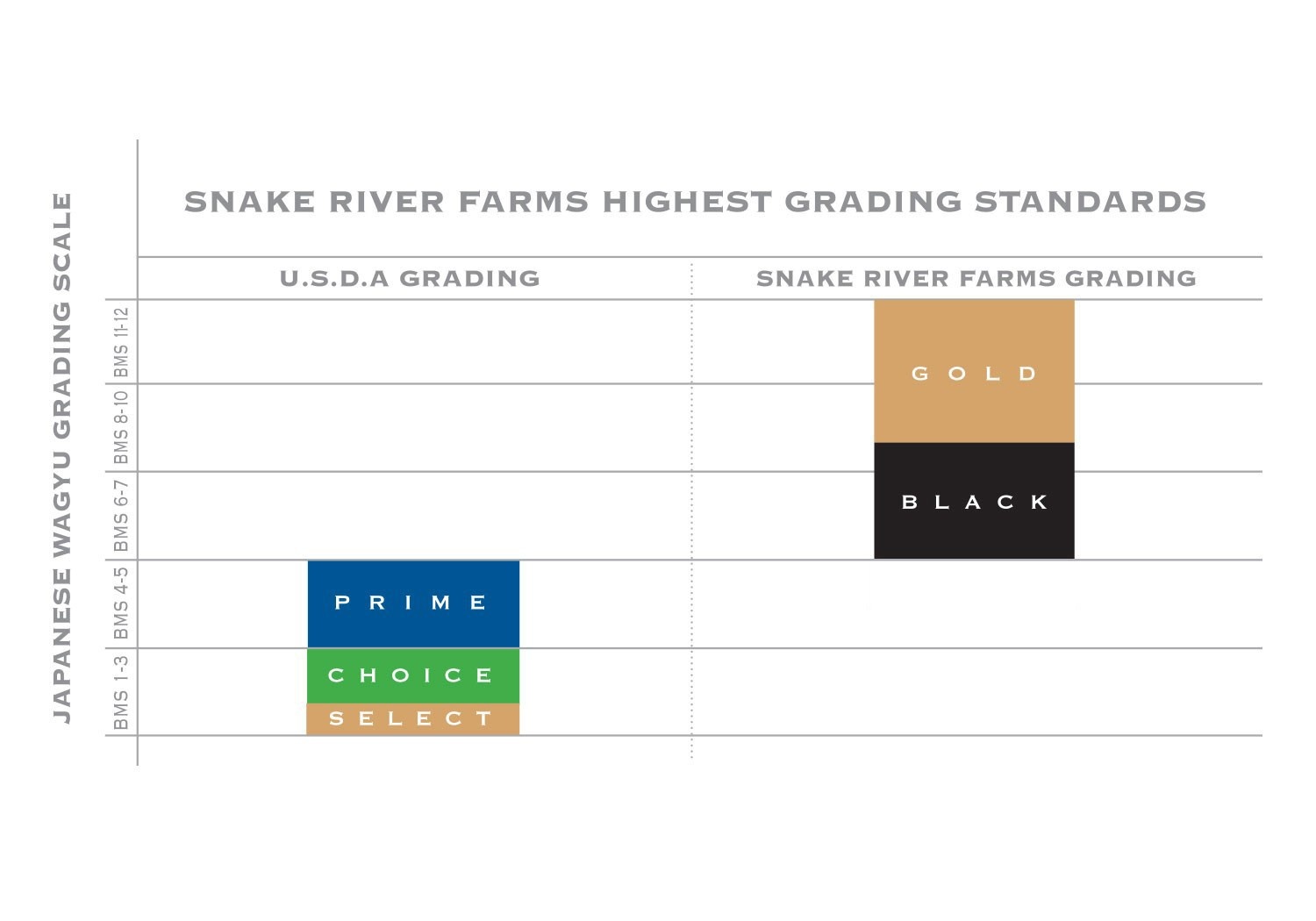 A classificação USDA Prime, a mais elevada do USDA, não representa adequadamente a qualidade dessa carne distinta e deliciosa. “Apenas 3% de toda a carne bovina nos EUA recebe a designação de Prime, ainda que a Snake River Farms exceda o padrão. Por esta razão, utilizamos a escala de marmoreio japonesa que mede com precisão o marmoreio na carne da Snake River Farms”, informa a companhia.