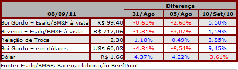 Observe no gráfico acima, como o boi gordo recua desde início de agosto e a carne no atacado sobe desde o final de agosto. Com isso, a diferença entre os dois diminui, aumentando a rentabilidade do frigorífico e dando firmeza aos preços do boi gordo.