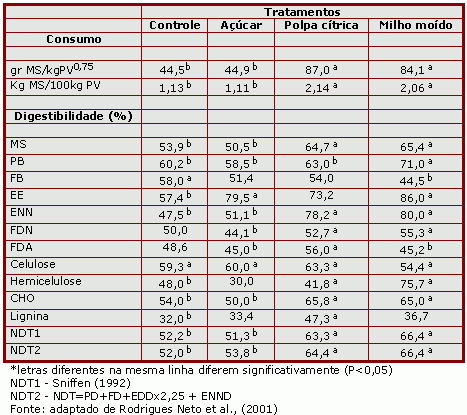 Houve diferença significativa no consumo entre as silagens, sendo maior para os aditivos de milho moído e polpa cítrica (tabela 3). O consumo, superior a 80 g/Kg de PV0,75, foi semelhante a consumo observado para volumoso de alta palatabilidade. O consumo de matéria seca da silagem sem aditivo ou com açúcar, permitiu ingestão de 17 MJ de EM/dia, enquanto a silagem com milho moído e polpa cítrica possibilitou a ingestão de 39,5 MJ de EM/dia para animais de 180 kg de peso vivo.