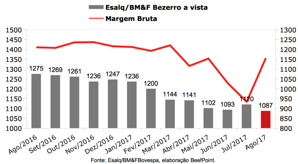 Indicador do boi gordo à vista apresentou alta de 1,05%, cotado a R$ 136,25/@. Bezerro apresentou baixa de 0,24%, cotado a R$ 1090,72/cabeça. O dólar apresentou alta de 0,16%, cotado a R$ 3,16.