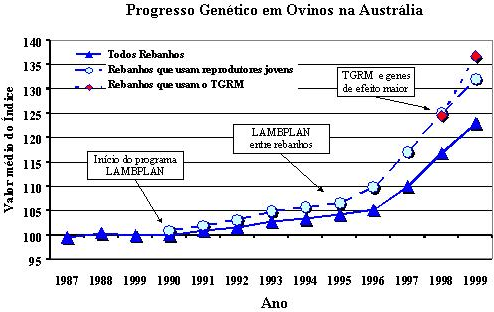 Um exemplo do que pode acontecer com implementações de MMM (Metodologia de Modelos Mistos), testes de touros jovens, programa de acasalamento dirigido, e aplicação de novas biotecnologias, é claramente mostrado por Banks (2006), com dados de um programa de melhoramento genético de ovinos na Austrália (LambPlan) corforme a figura a seguir.