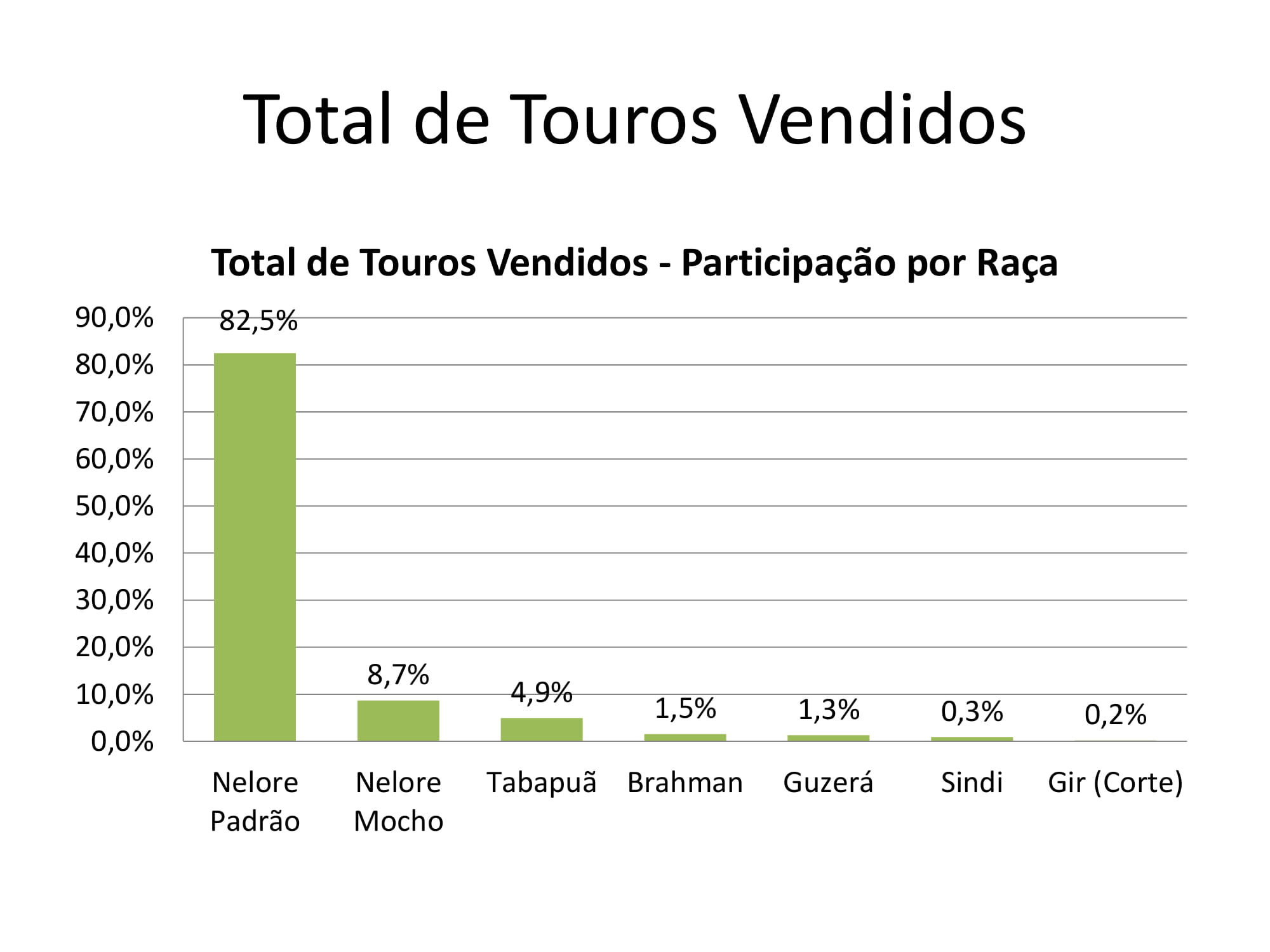 Já com relação às raças zebuínas ofertadas pelos criatórios, em 2017, destaque para o Nelore padrão, com 16.949 touros vendidos. Em seguida, está o Nelore mocho, com 1.750 animais, logo à frente do Tabapuã, com 1.079 reprodutores. A raça Brahman registrou 305 produtos negociados, enquanto o Guzerá teve a comercialização de 283 exemplares, finalizando com os animais Sindi (68) e Gir Corte (38), totalizando 20.472 reprodutores comercializados.