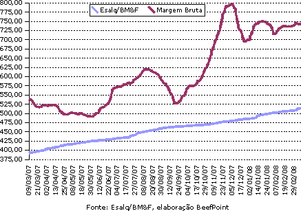 Gráfico 1. Indicador Esalq/BM&F bezerro MS à vista x margem bruta na reposição