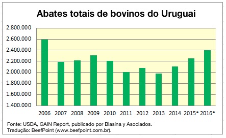 Segundo um relatório do Departamento de Agricultura dos Estados Unidos (USDA) sobre o setor pecuário do Uruguai, o país terá 11,92 milhões de bovinos até o final do ano que vem devido aos altos abates, a uma menor produção de bezerros e às fortes exportações de animais vivos. A queda seria de 1,3% com relação aos 12,06 milhões de bovinos que o USDA estima para 2015. Seria a primeira queda desde 2010 do rebanho uruguaio.