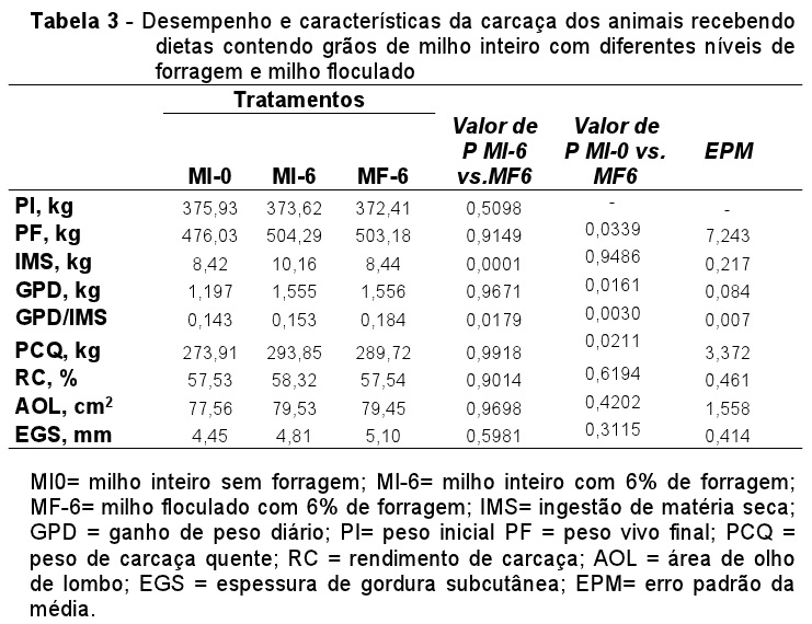 Segundo Traxler et al. (1995), animais alimentados com grãos de milho inteiro sem forragem, apresentaram menor IMS, GPD similar e melhor eficiência alimentar (GPD/IMS) que os animais alimentados com grãos de milho quebrado com forragem na dieta, como pode se observado na Tabela 1.