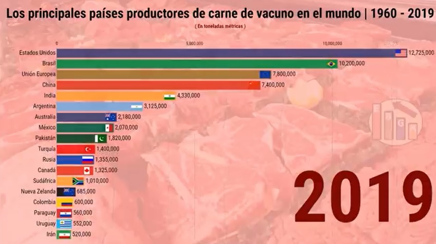 Um vídeo postado no canal Entre barras, gráficos y mapas mostra a evolução dos países na produção de carne bovina.