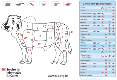 Durante a Feicorte, realizada em São Paulo no início de junho, o SIC lançou um folheto (Figura 1) onde são mostrados os cortes bovinos, localização e formas de preparo adequadas. Os nomes mostrados são os mais habituais no Brasil, sendo que no site do SIC (www.sic.org.br) pode-se encontrar informações complementares como nomes regionais e subcortes (como os cortes variantes do lombo, por exemplo).