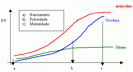 Figura 2: Curva de crescimento dos músculos, gordura e ossos. Adaptado Luchiari Filho (2000).