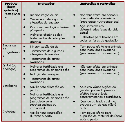 Por esta característica de cada hormônio ser indicado para determinadas situações, não é concebível o uso de qualquer um deles de forma generalizada. A indicação é muito específica e o animal deve ser cuidadosamente avaliado, para que se saiba se realmente o produto irá fornecer os resultados desejados. Da mesma forma, não se recomenda a utilização de hormônios para corrigir falhas de manejo, como problemas nutricionais, falha de detecção de cio e outras. Assim, relacionados á reprodução, não existem hormônios recomendados para utilização em todos os animais do rebanho, de uma única vez. Deve-se avaliar quais os animais que realmente necessitam de tratamento, pois desta forma a economia é substancial, visto que o preço destes produtos é relativamente elevado.