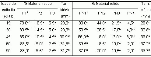 Tabela 1. Retenção percentual de partículas de Brachiaria brizantha cv. Marandu, submetidas a diferentes idades de colheita, utilizando o método Penn State Particle Size Separator convencional e adaptado com quatro bandejas.