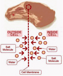 Colocar a carne na salmoura (isto é, colocar a carne numa solução de sal com água) acrescenta umidade à carne pela osmose. A osmose acontece quando a água flui de uma concentração mais baixa de uma solução para uma concentração mais alta, através da membrana semipermeável. Na carne, a membrana é a membrana plasmática que rodeia as células individuais. Quando a carne é colocada na salmoura, os fluidos celulares da carne estão menos concentrados que a água salgada da solução de salmoura. A água flui das células da carne e o sal flui para dentro O sal dissolve algumas das proteínas da fibra, e os fluidos celulares ficam mais concentrados, e, por conseqüência, traz de volta a água para dentro. A salmoura adiciona sal e água a elas, de maneira que quando a carne for cozida e a água for induzida para fora, haverá ainda água aprisionada nas células porque a água foi adicionada antes do cozimento.