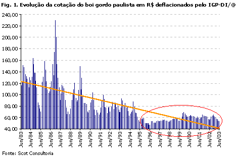 A cotação da arroba do boi gordo vem caindo ao longo dos últimos vinte anos, conforme exposto na figura 1, tendência observada para a maioria das commodities agrícolas. Porém, nos últimos 7 anos (círculo vermelho), o mercado físico do boi gordo passou a operar em ambiente mais firme.