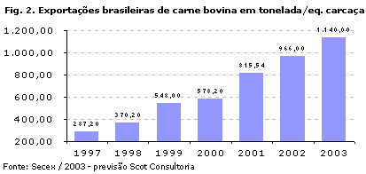 Vamos aos números. As exportações brasileiras de carne bovina, em 2002, geraram um faturamento de US$1,096 bilhão, referentes a um montante exportado de 966 mil toneladas em equivalente carcaça.